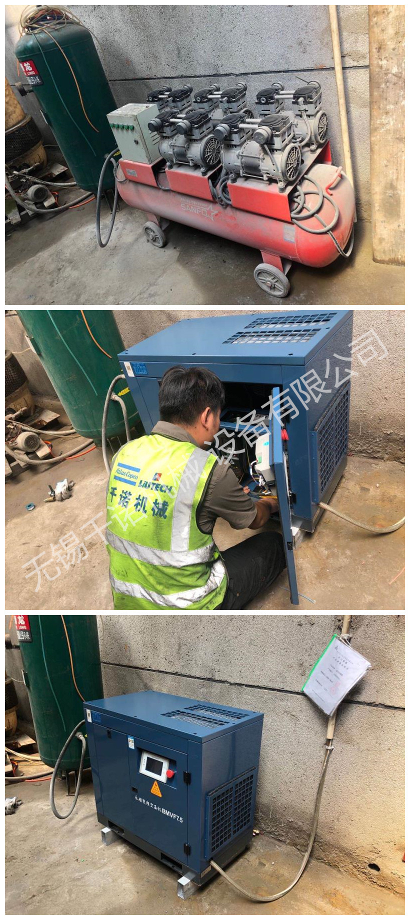 接到一客戶訂單其舊的活塞機(jī)供氣不足,維修代價(jià)較高要求將其活塞機(jī)改裝至開(kāi)山7.5KW BMVF7.5永磁變頻螺桿機(jī)。